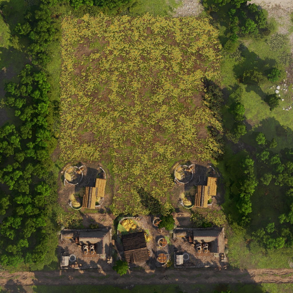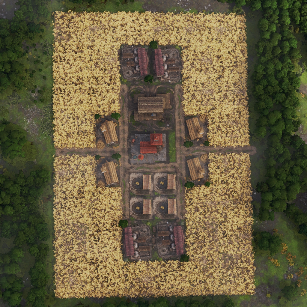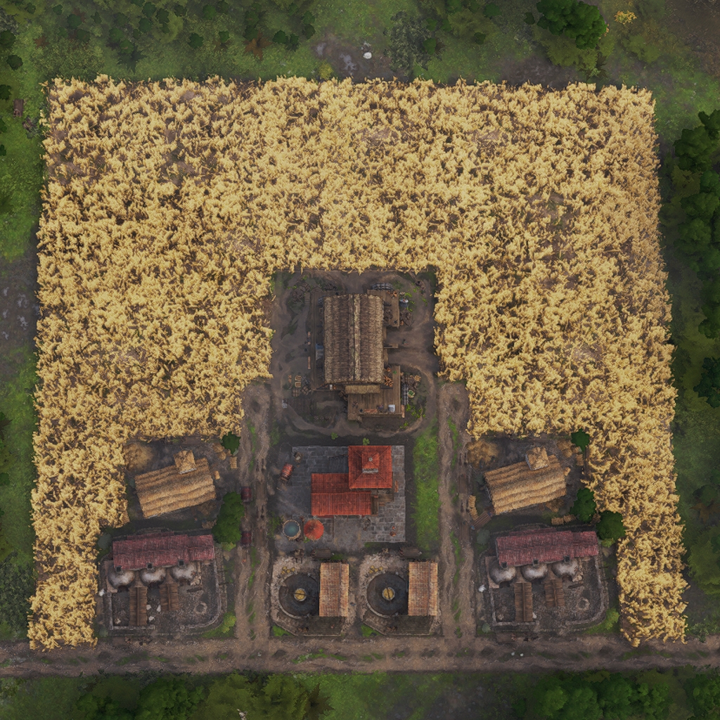 It features 4 full production chains as well as a warehouse to store the goods. Roads can exit on all four connection points.