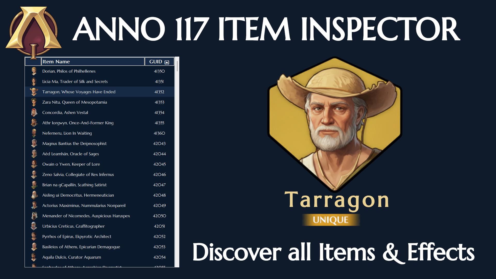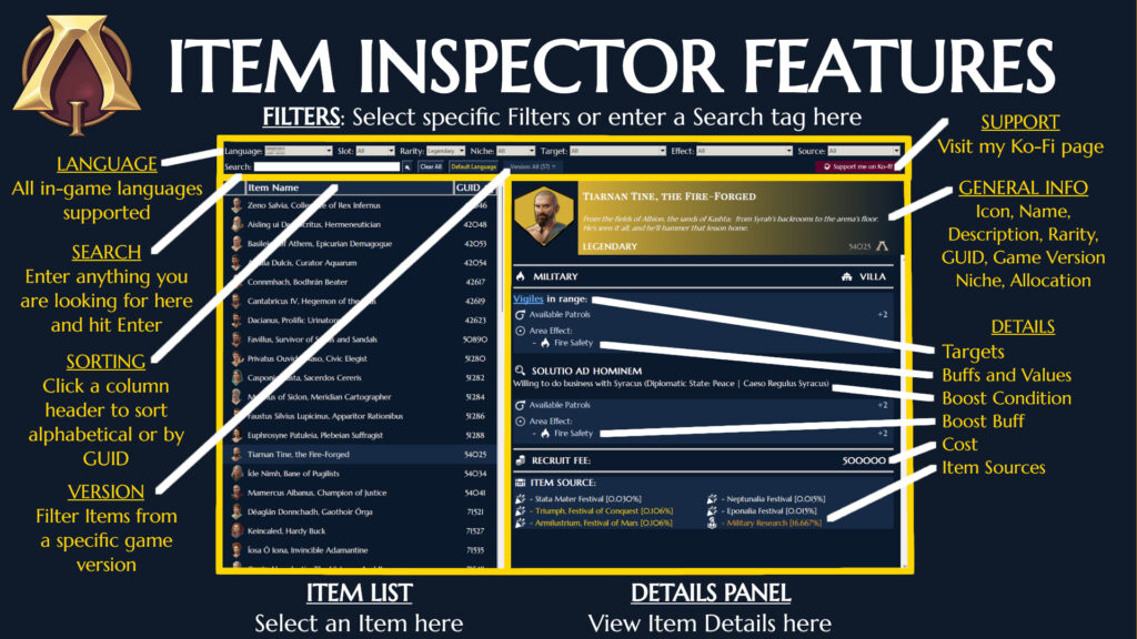 A standalone desktop utility designed to browse, filter, and analyze item data for ANNO 117: Pax Romana. This tool provides a deep-dive interface for the game’s item data, allowing players to find the perfect specialist or captain for their next Roman empire.