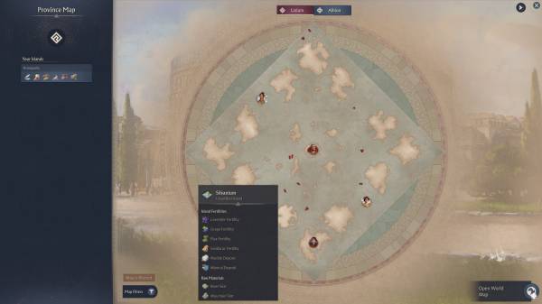 For a quick overview, players have the option of examining the available fertilities and lodes of a specific island by hovering over the icons positioned above the minimap.